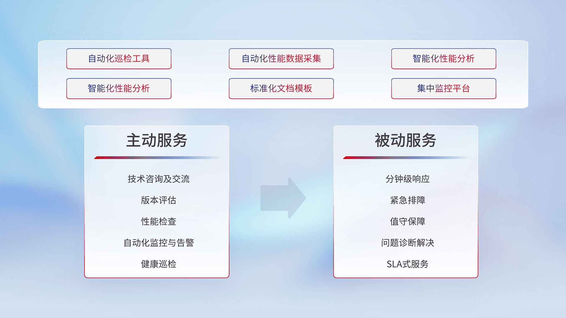 智能化工具和标准化文档,,,,保障服务质量,,提供主动服务(包含技术咨询、、、、版本评估、、、性能检查、、、、自动化监控与告警、、、健康巡检)和被动服务包含(分钟级响应、、、紧急排障、、、值守保障、、问题诊断解决、、、、SLA服务)。。。